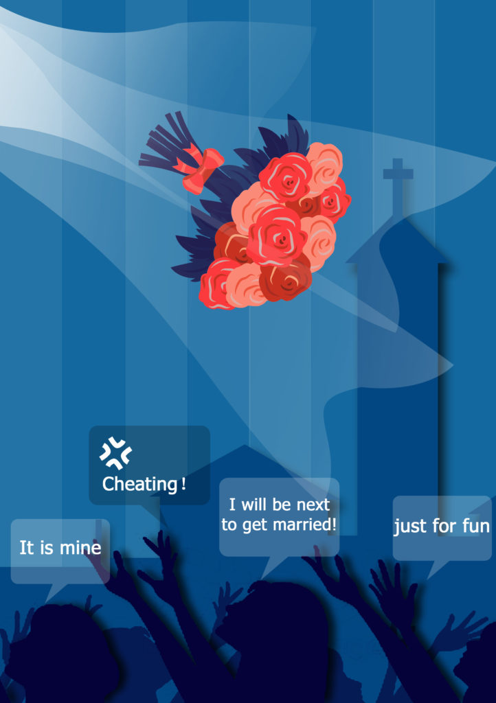 Tossing the Bouquet: She married him. She passed on her good fortune to another single lady. This poster represents people’s emotions at the wedding.
